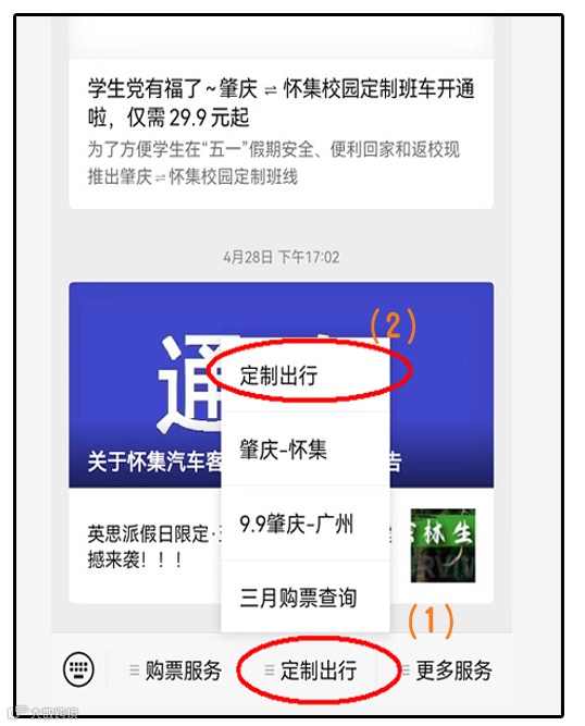 第一步,在肇庆粤运公众号上点击“定制出行”菜单