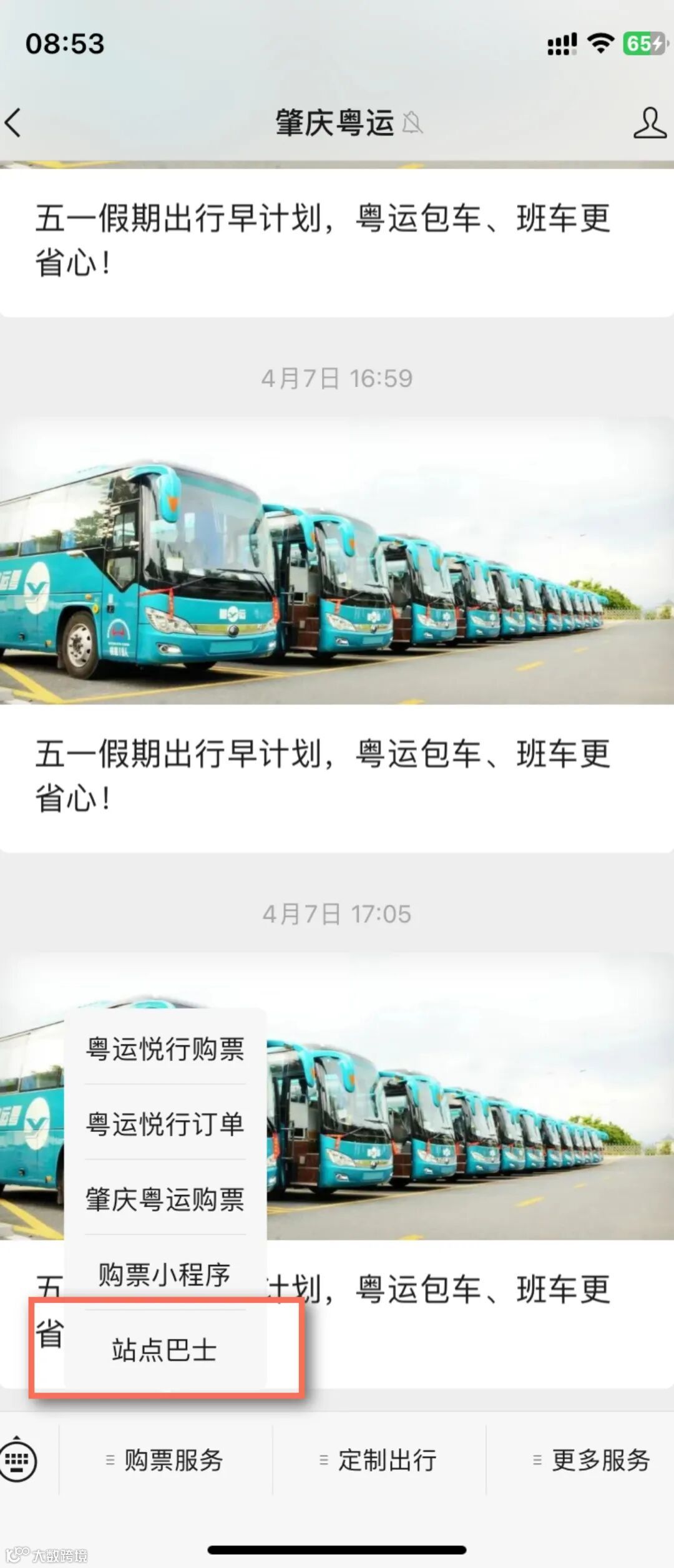 方式二:关注【肇庆粤运】公众号,点击【站点巴士】子菜单购票