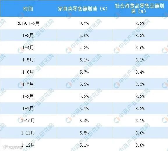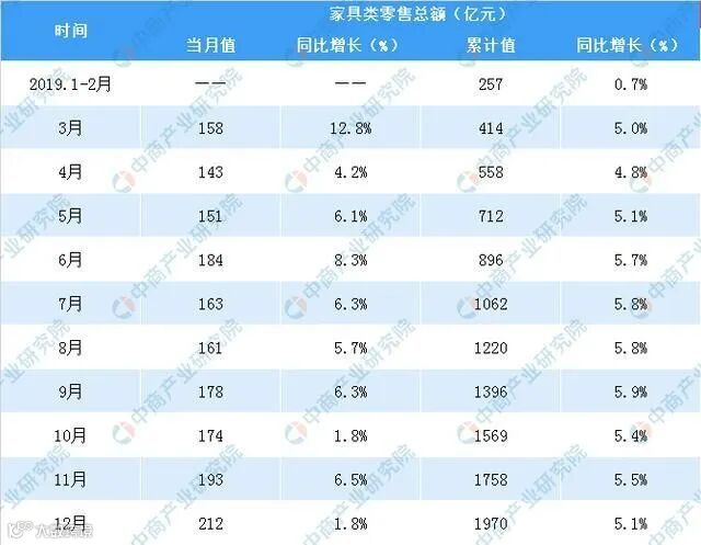 2019年1-12月,全国家具类零售额为1970亿元,与上年同期相比增长5.1%。