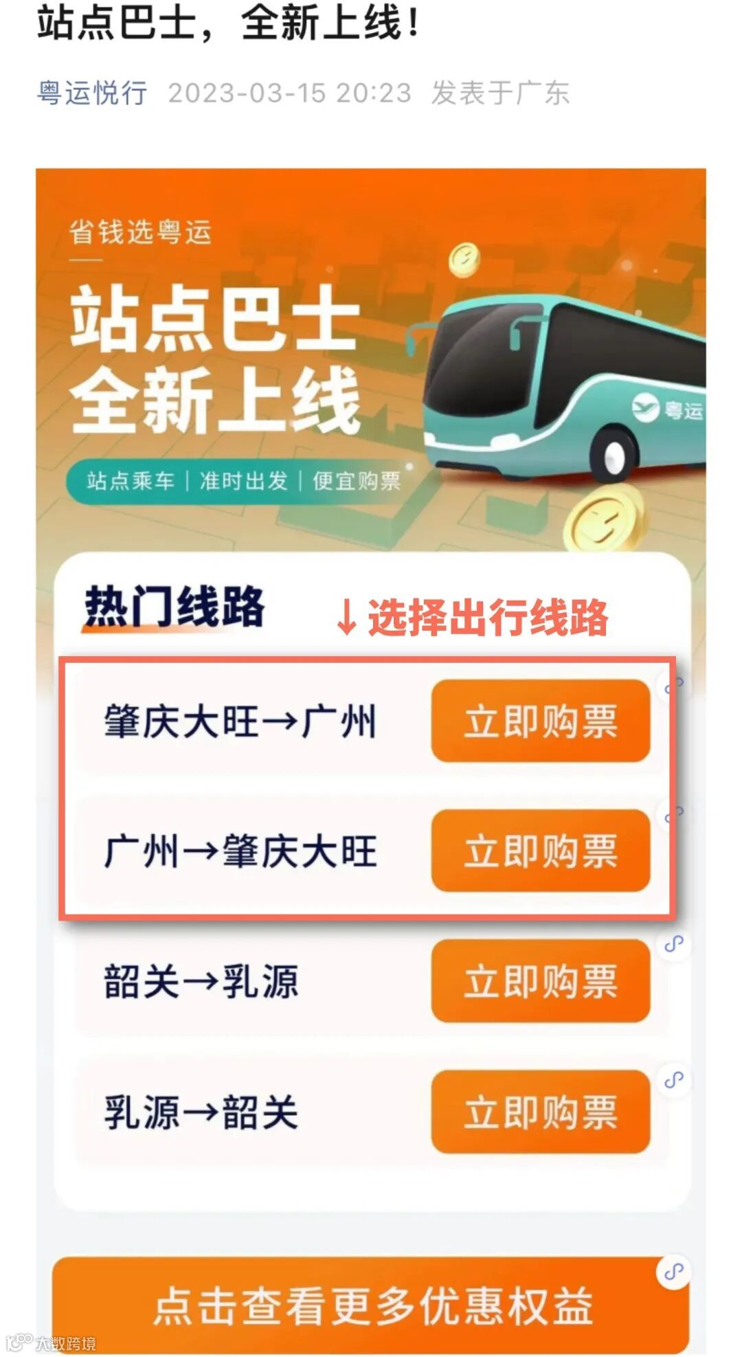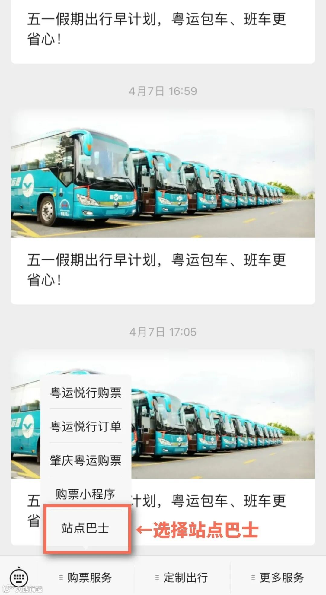 关注“肇庆粤运”公众号,点击【购票服务】-【站点巴士】