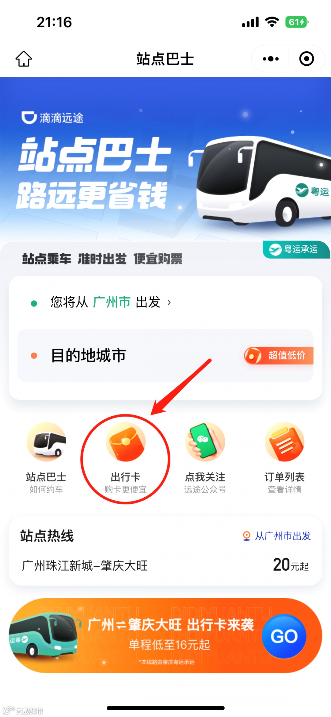 ①关注公众号【肇庆粤运】后,点击菜单栏“购票服务”—“站点巴士”进入购票首页,点击“出行卡”图标,进入购卡页面操作即可。