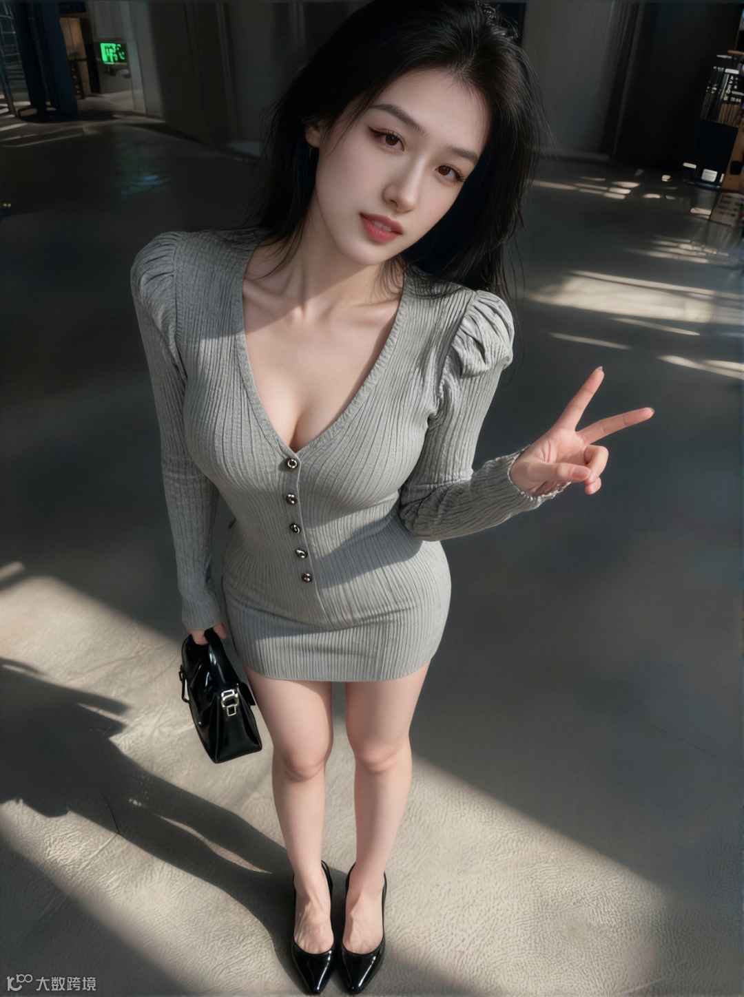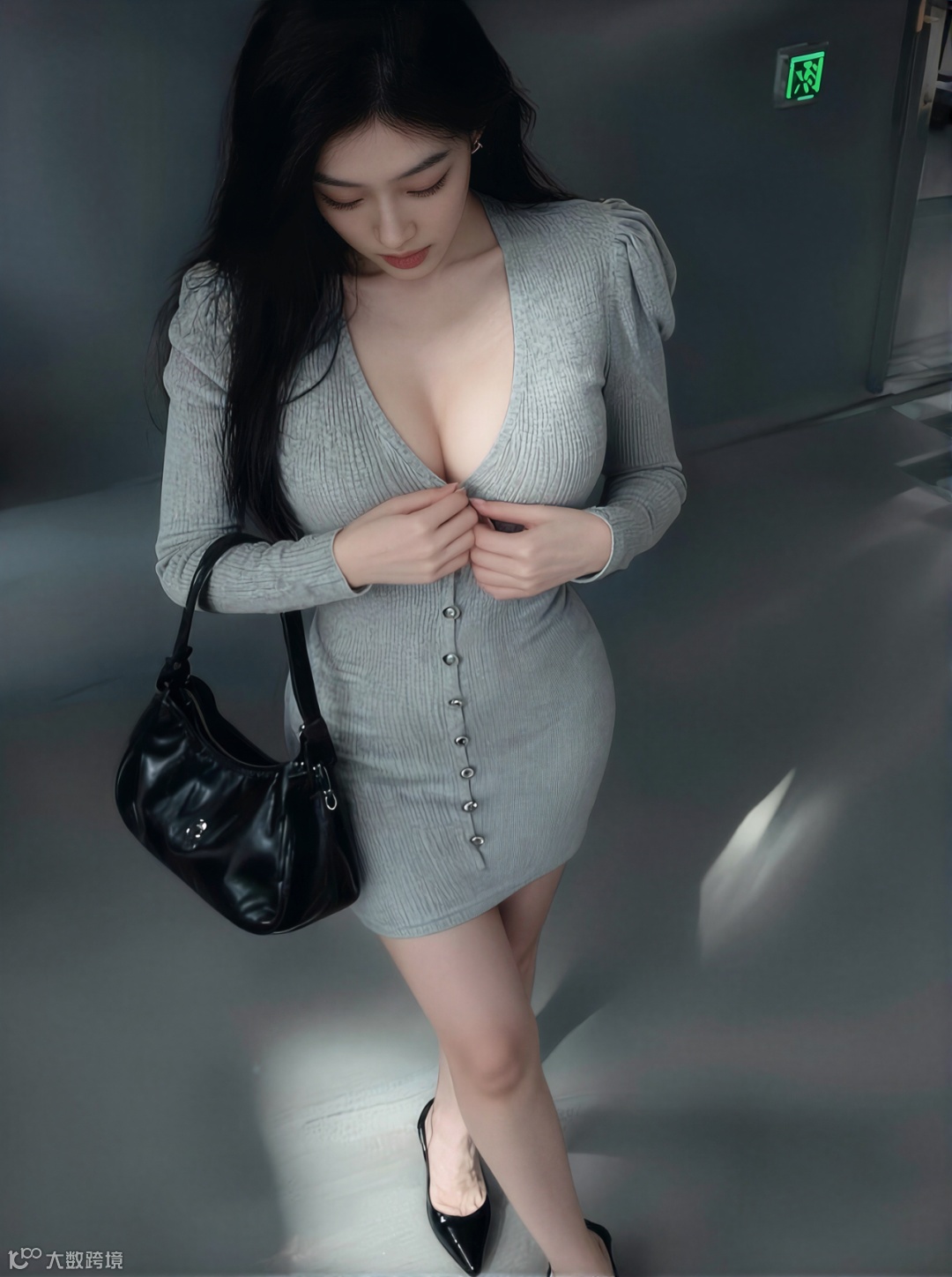 针织纹理随呼吸轻颤,高跟鞋托起修长的剪影。蹲坐时裙摆微漾,倚墙时腰线如弦——每一寸剪裁都是对身体的礼赞。皮质手提包斜倚臂弯,慵懒中透出掌控全局的从容。