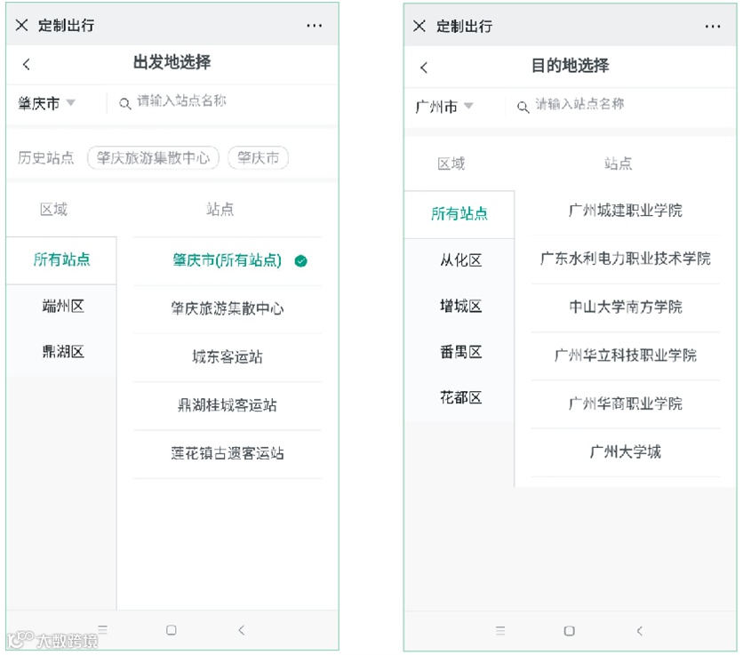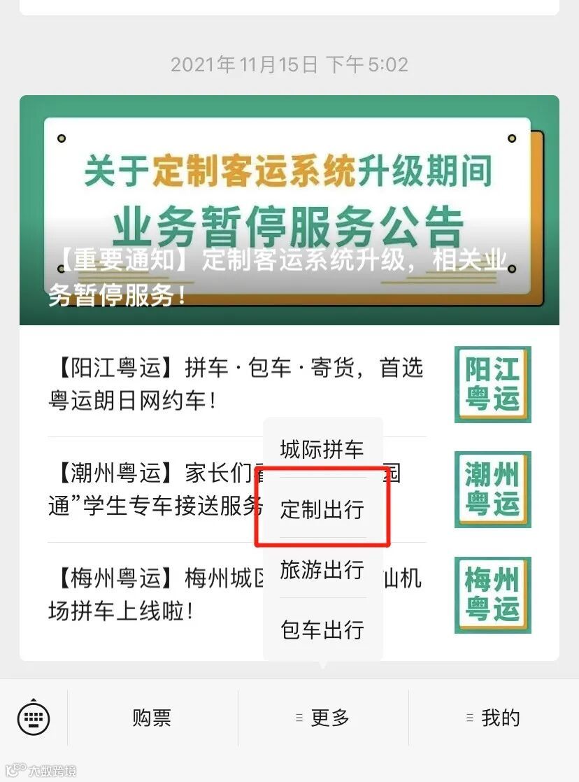 进入“肇庆粤运公司”微信公众号页面,点击“定制出行”按键---选择“定制出行”,跳转至“定制出行”订单页面。