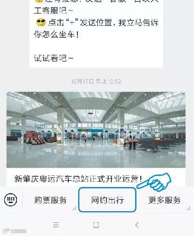 1、扫二维码关注肇庆粤运公司公众号→点击“网约出行”;