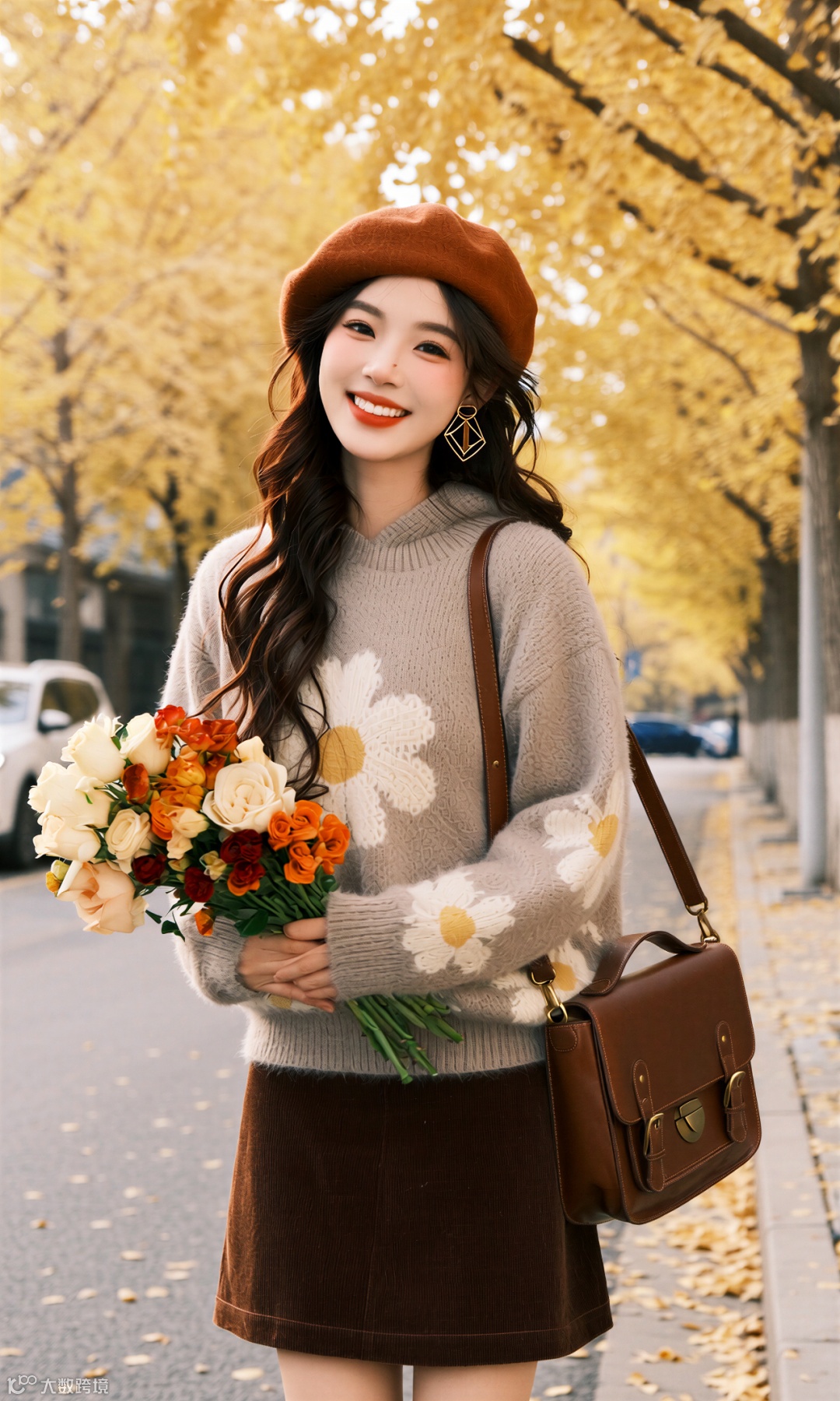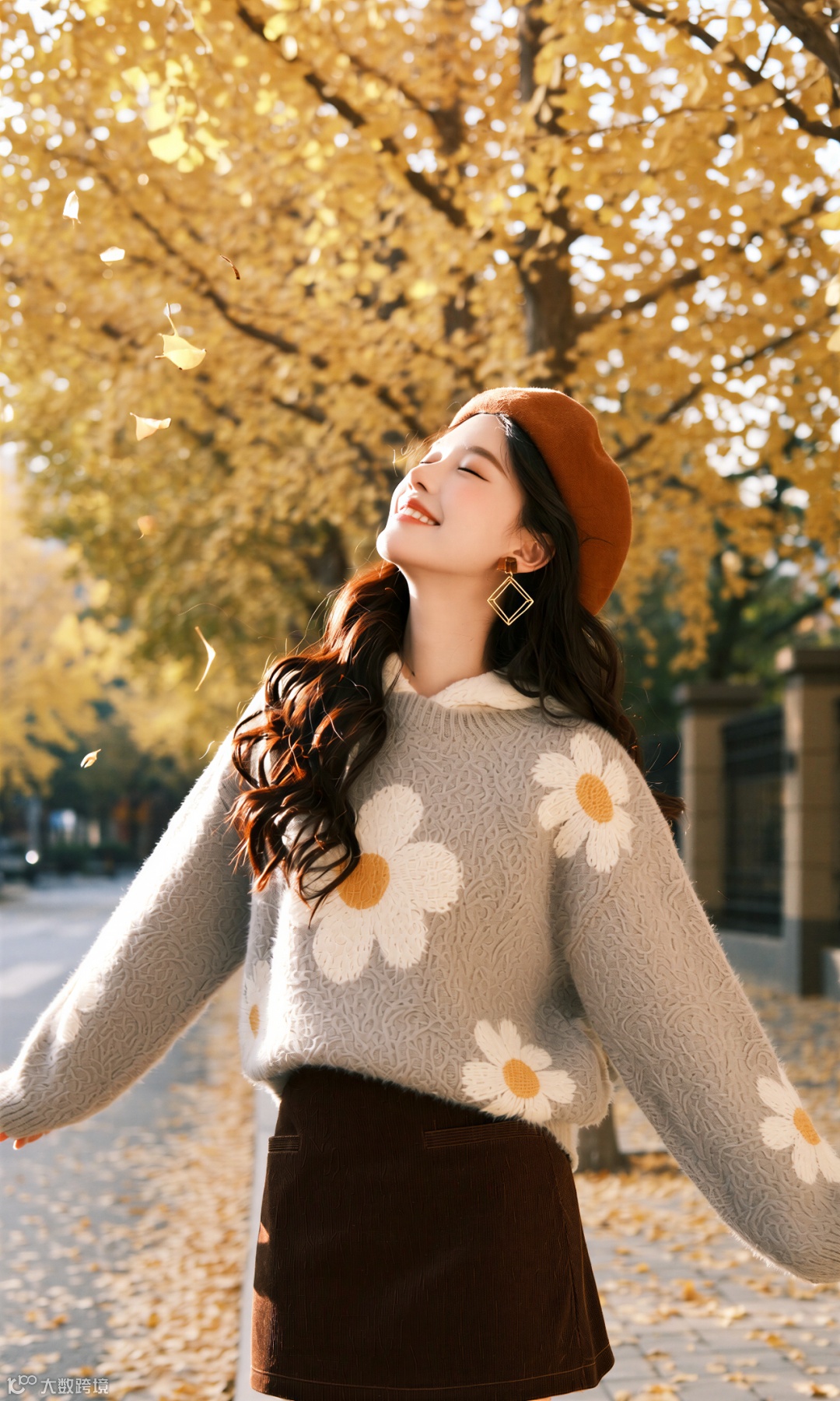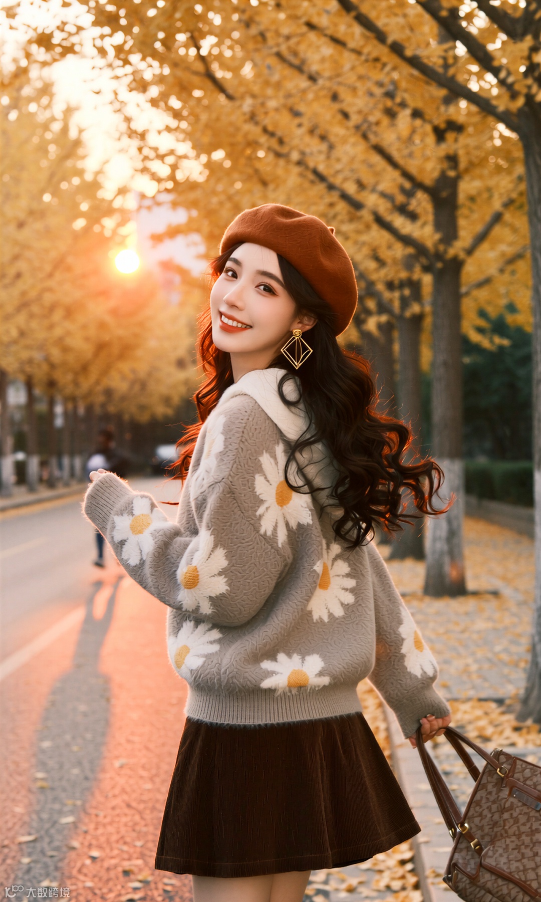 当第一枚银杏叶飘落脚边,整座城市便浸透了秋的私语。她踩着沙沙的节拍走来,米灰毛衣裹着云朵般的柔软,焦糖色贝雷帽斜扣着恰到好处的俏皮。这身装束不是对抗秋凉的盾牌,而是与季节相拥的仪式。
