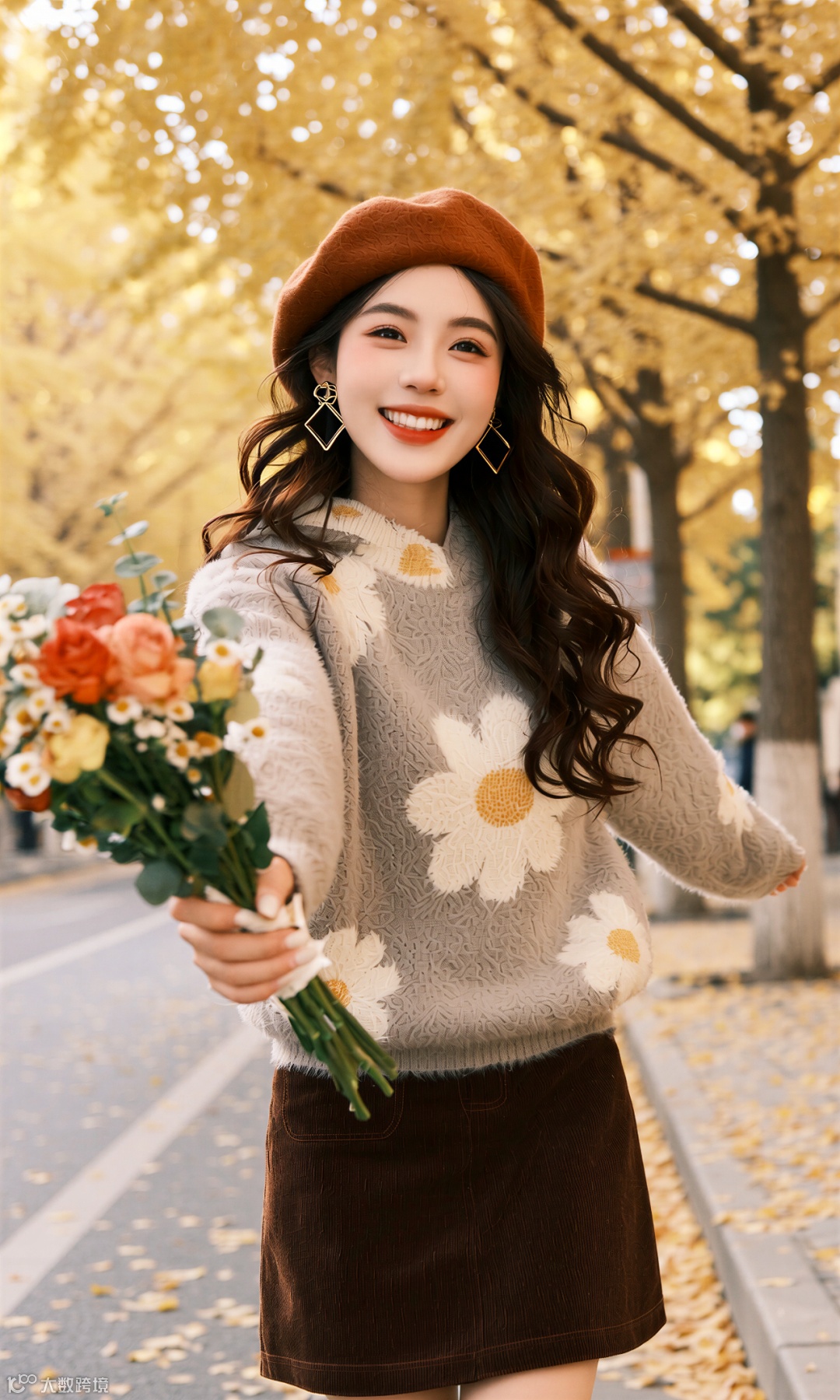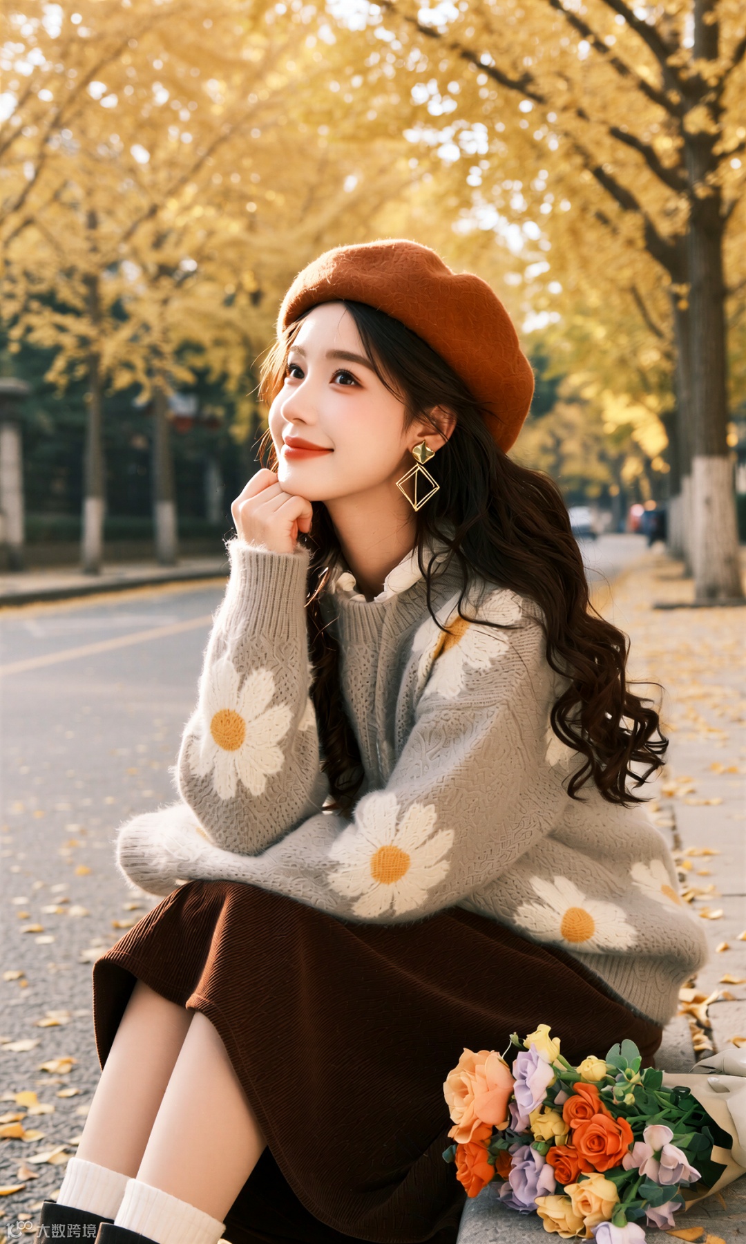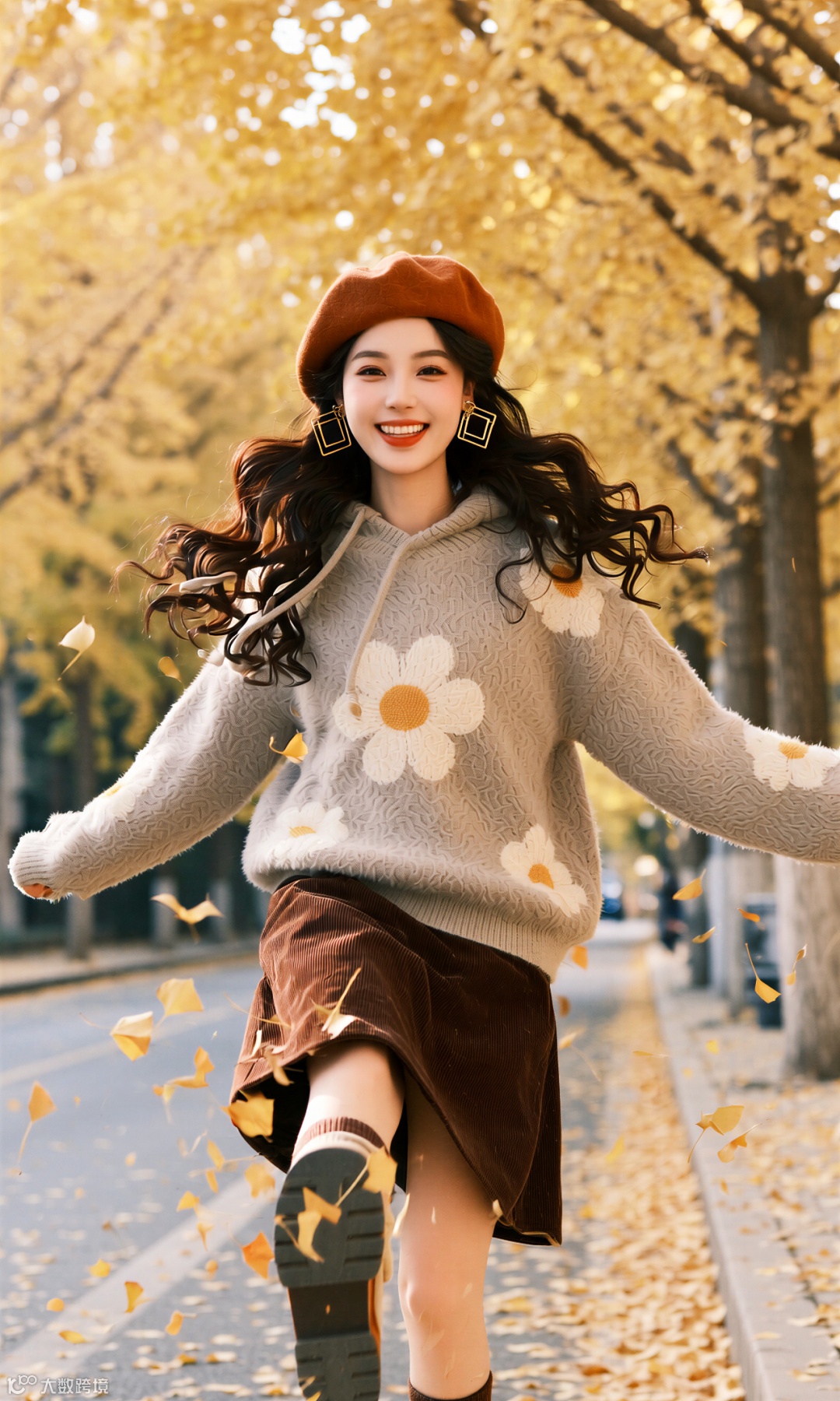 当第一枚银杏叶飘落脚边,整座城市便浸透了秋的私语。她踩着沙沙的节拍走来,米灰毛衣裹着云朵般的柔软,焦糖色贝雷帽斜扣着恰到好处的俏皮。这身装束不是对抗秋凉的盾牌,而是与季节相拥的仪式。