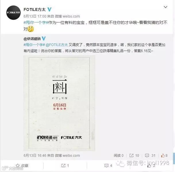 6月13日——15日,依诺和大家玩了三天的造字游戏,通过陶城报微信端、陶瓷信息微信端和依诺官方微博三个平台,每天甩你一个字,翻遍康熙字典也找不到,这三个字究竟是什么意思,引起了大家很大的兴趣,就连发起#甩你一个字#活动的方太都转发了这篇微博,还赞依诺是个有料的宝宝,6月16日揭秘答案的微信更是达到13000多的阅读量。