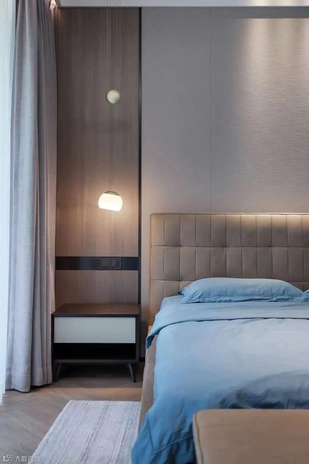 自然的材质与温润的基调令人在私密的环境里瞬间找到安全感,蓝色布艺烘托出随性的气息,让卧室的氛围变得温情脉脉。