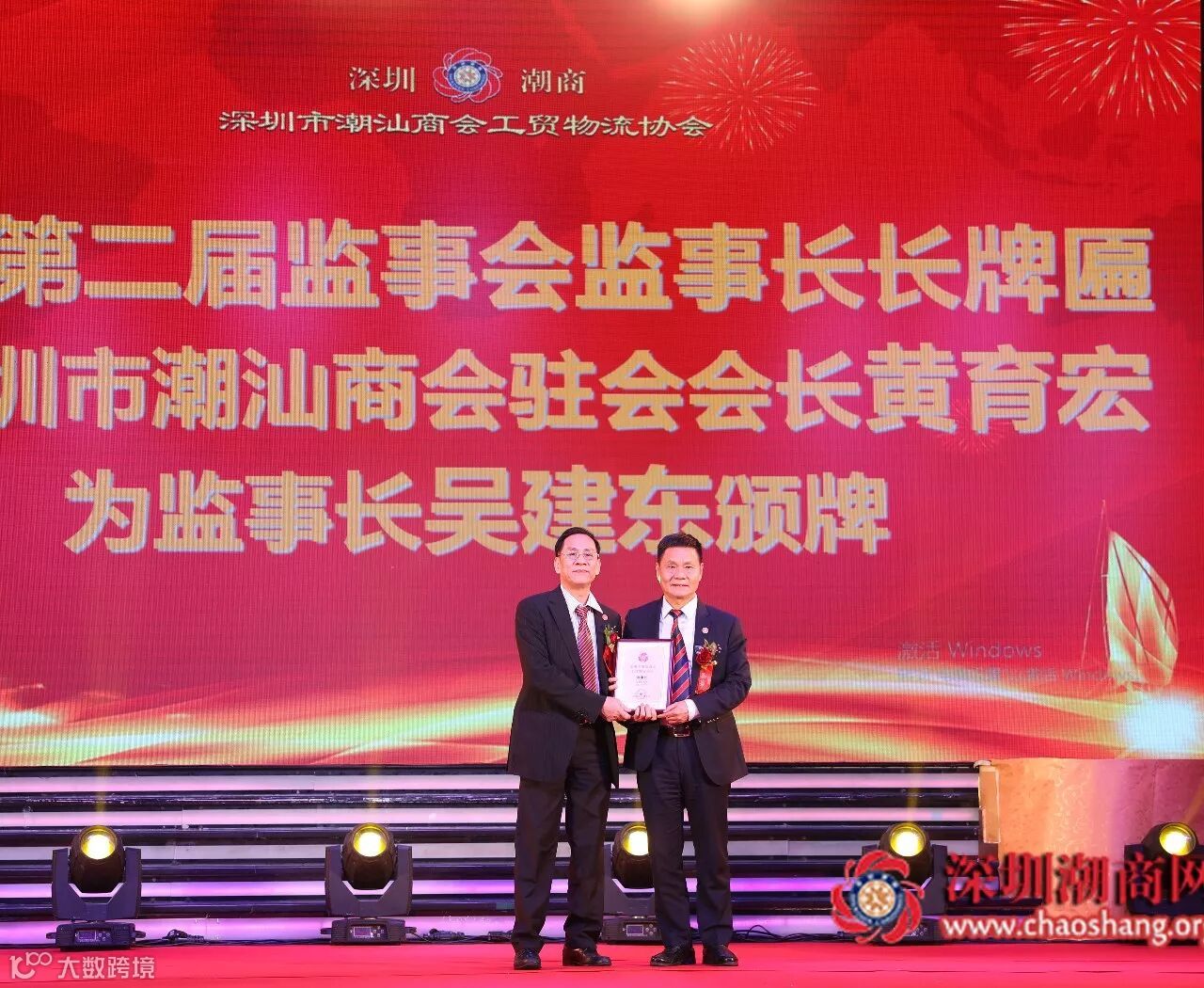 深圳市潮汕商会驻会会长黄育宏为深圳市潮汕商会工贸物流协会监事长吴建东颁牌