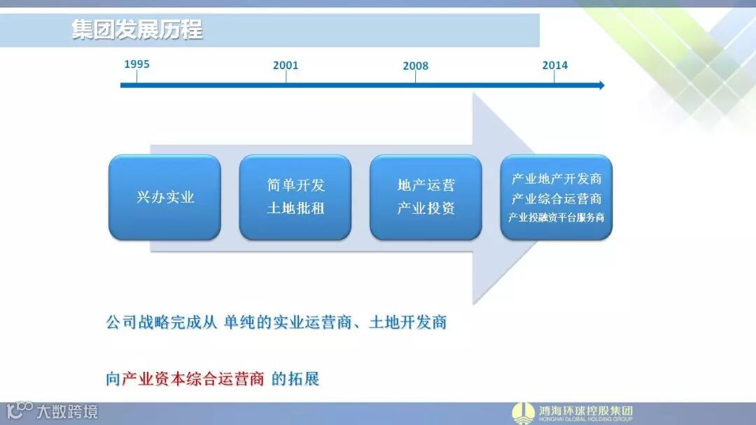 鸿海环球控股集团创立于1995年,历经二十余年快速发展,成为集产业投资、产业运营、高端制造、商住地产、文化旅游、健康养老等领域跨行业、跨地区经营的大型综合性现代化企业集团。2014年,鸿海融合资源,正式成立鸿海环球控股集团,旗下共拥有数十家核心成员企业。