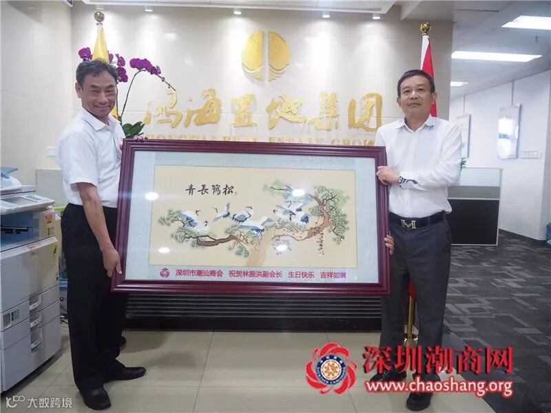 走访期间,黄梓琪秘书长代表商会向林振洪副会长送上会旗和纪念品,并送上一幅潮绣珍品作为生日贺礼和生日鲜花表示祝贺。