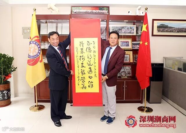 走访期间,黄梓琪秘书长代表商会为黄明树副会长授会旗、赠送纪念品,同时赠送一幅书法作品作为生日贺礼。书法对联内容是:“正德明道通四海,积基树本聚荣华”。