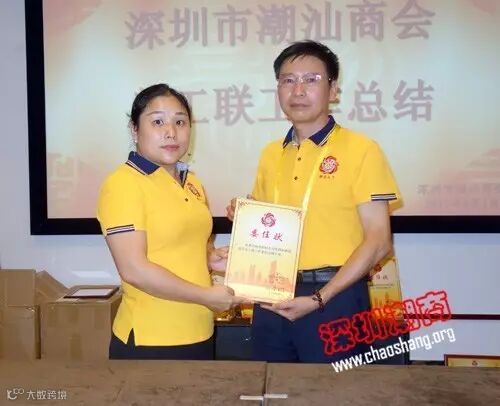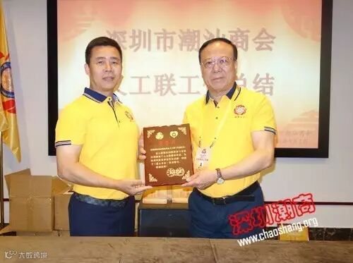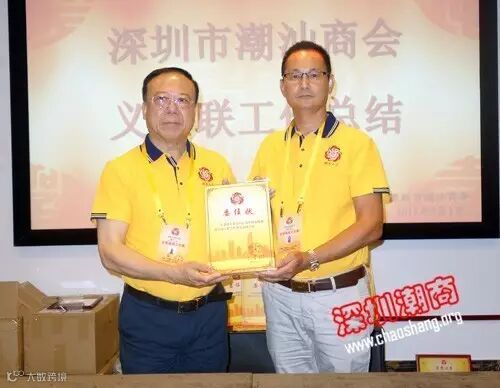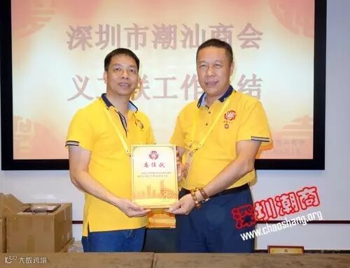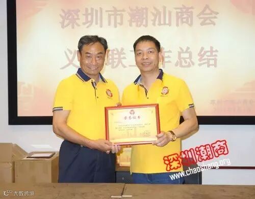 轮值会长陈镇文(左)向佘桂锡主席(右)颁发商会和深圳市血液中心联合颁发的荣誉状