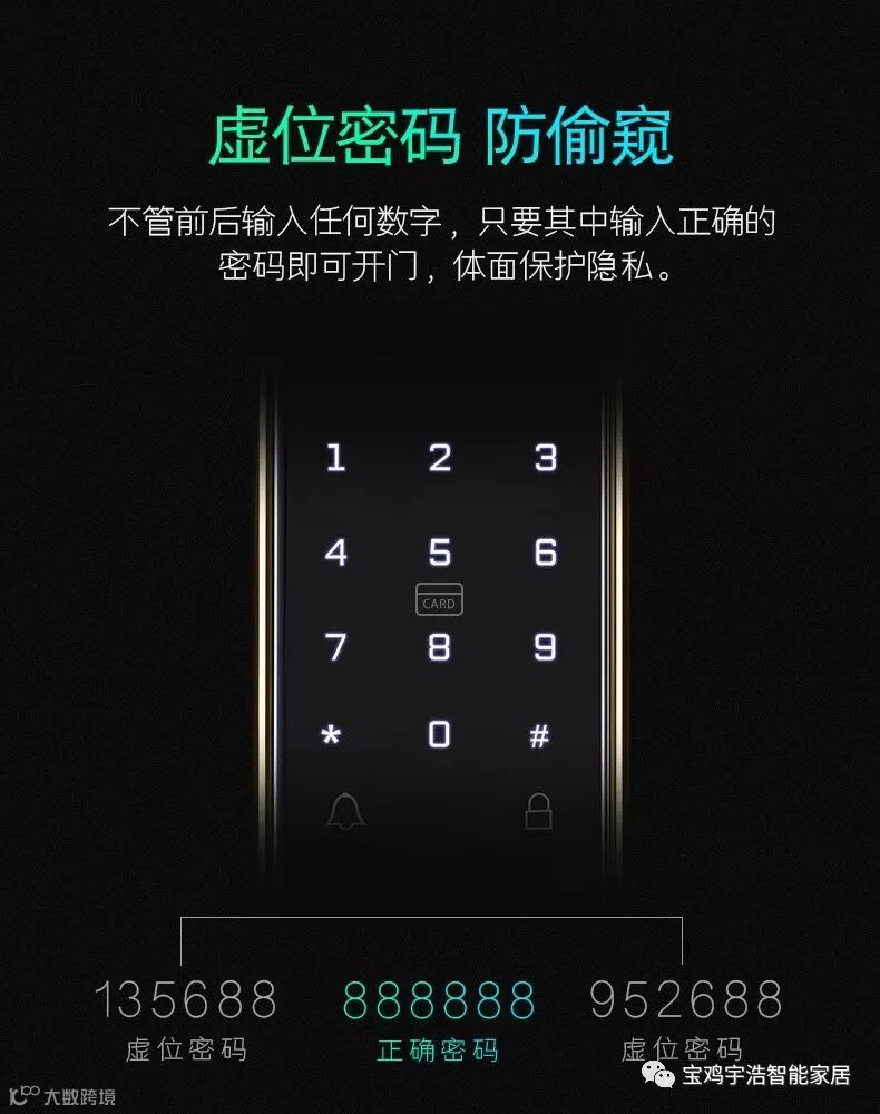 您在选购智能锁时,是否留意到宣传资料中关于密码功能一栏写着“虚位密码”四个字。虽然当时导购有给您详细讲解,但是在实际应用过程中,这个功能究竟有什么用处?好处又是什么?今天就这个问题,我们来深入了解。