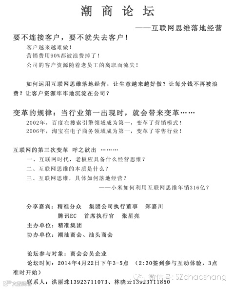 尊敬的商会同仁:由精准集团、腾讯EC联合主办,我会与汕头商会协办的第一届潮商论坛4月22日下午三时在汕头商会举行,专家解密互联网思维本质,如何运用互联网思维产业升级及具体落地使用,诚邀您参加。地址:福田区福强路金沙嘴大厦14层会议室。出席请电会员部:洪丽珠13923711073、林晓云13923711850【深圳市潮汕商会】