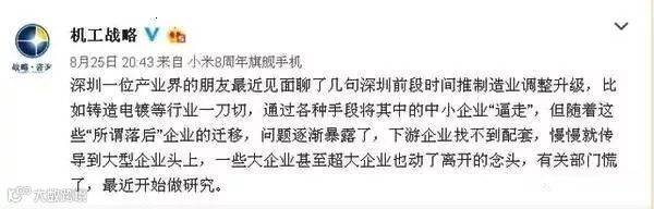 在网络上,不断有人反映一些地方的环保一刀切对企业,乃至整个行业造成的伤害。例如,机械工业信息研究院(原机械部科技情报所)战略所官方微博最近就披露:深圳一位产业界的朋友最近见面聊了几句深圳前段时间推制造业调整升级,比如铸造电镀等行业一刀切,通过各种手段将其中的中小企业“逼走”,但随着这些“所谓落后”企业的迁移,问题逐渐暴露了,下游企业找不到配套,慢慢就传导到大型企业头上,一些大企业甚至超大企业也动了离开的念头,有关部门慌了,最近开始做研究。