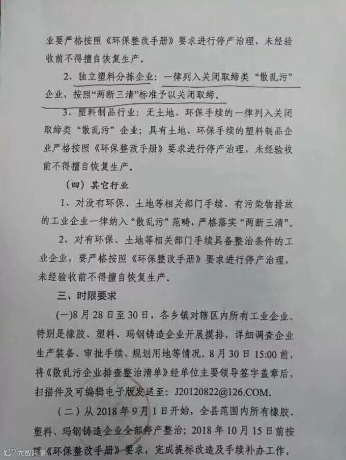 从2018年9月1日开始,全县范围内所有橡胶,塑料,铸造企业全部停产整治。