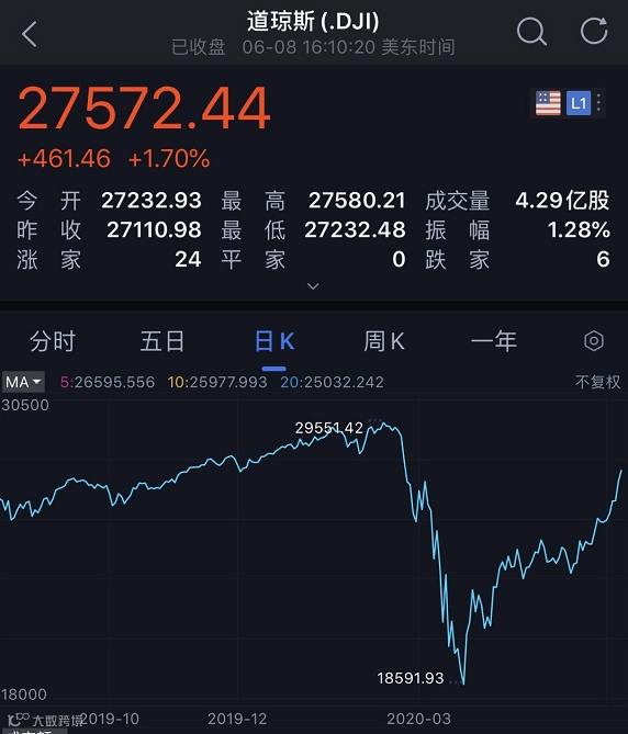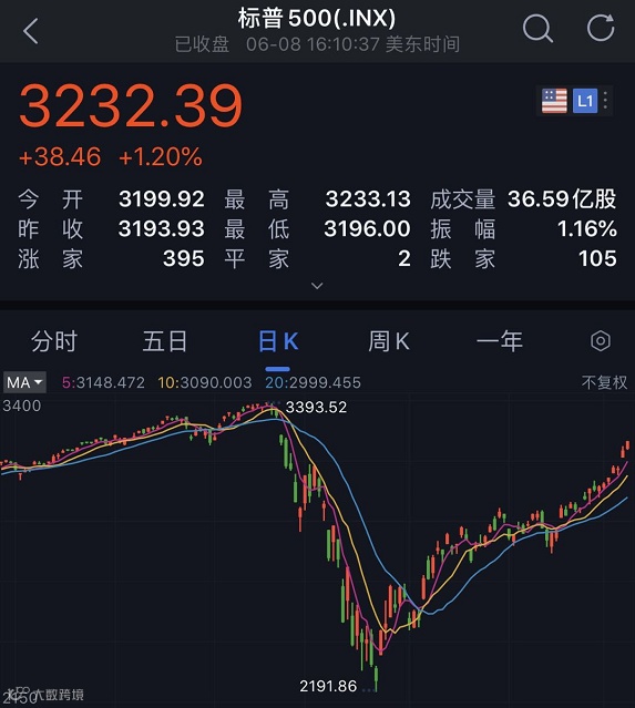 美东时间6月8日16:00(北京时间6月9日04:00),标普500指数收涨38.46点,涨幅1.20%,报3232.39点;道指收涨461.46点,涨幅1.70%,报27572.44点;纳指收涨110.67点,涨幅1.13%,报9924.75点。纳指最高上涨至9927.13点,创盘中历史新高。