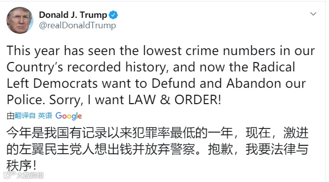 此外,特朗普还就持续蔓延的抗议活动表达了观点。他指出,“今年是美国有记录以来犯罪率最低的一年,而现在激进的左翼民主党人想要停止资助并抛弃警察。对不起,我要的是法律与秩序!”