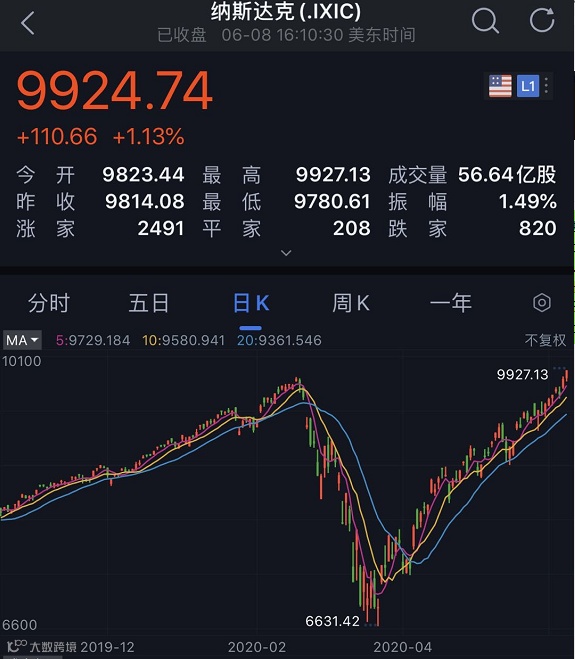 美股周一收高,纳指首次突破9900点,较3月23日的低位反弹逾44%,最高上涨至9927.13点,创盘中历史新高!而道琼斯指数从熔断底部已经上涨了近50%,标普500距离历史新高只差不到5%。