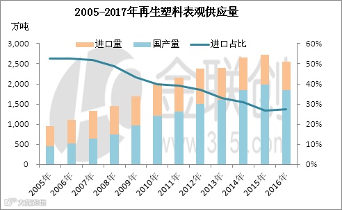 再生塑料进口基数较大,后期禁止进口后整体供应量损失严重。尽管在2013年海关绿篱行动后,进口政策收紧,后期进口量增速放缓,但在整体表观供应量中,进口料的占比仍高达30%左右。数据显示, 2016年再生塑料的表观供应量在2546.17万吨,进口量就高达696.17万吨,占比在27.34%。