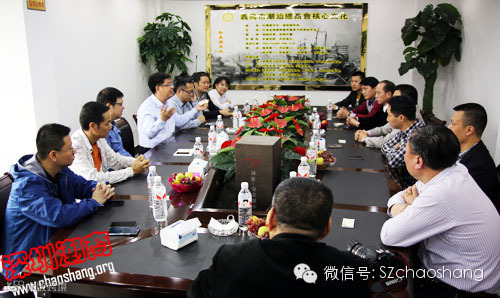 参观市场后,义乌市潮汕总商会李创羽会长和该会十多名常务副会长、副会长接待了考察团一行并进行座谈交流。黄榕城执行会长首先对李创羽先生刚刚当选义乌市潮汕商会第三届理事会会长表示祝贺,同时介绍了深圳市潮汕商会、揭阳商会、潮商集团、揭商集团抱团发展的做法。双方都表达了加强两地商会和商会企业之间的联系和合作的愿望。