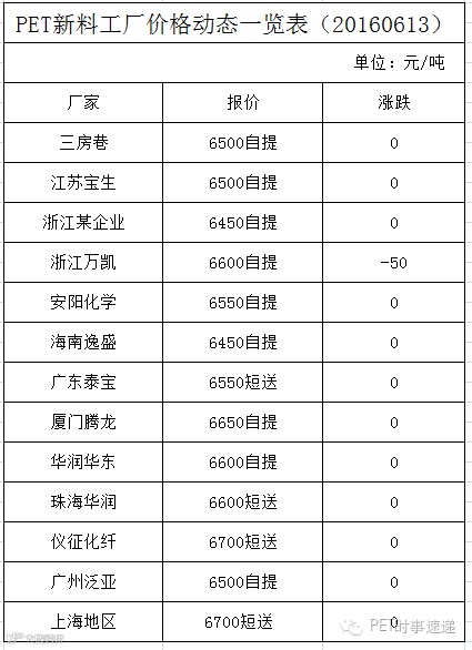 20160613通合资讯报道:上周五油价大跌影响业者心态,聚酯大盘信心不足。聚酯原料上行乏力,下游需求改善有限,买盘维持刚需,利好缺乏,今日市场将继续僵持整理,主流商谈华东6400-6450元/吨自提,华南6400-6500元/吨短送。