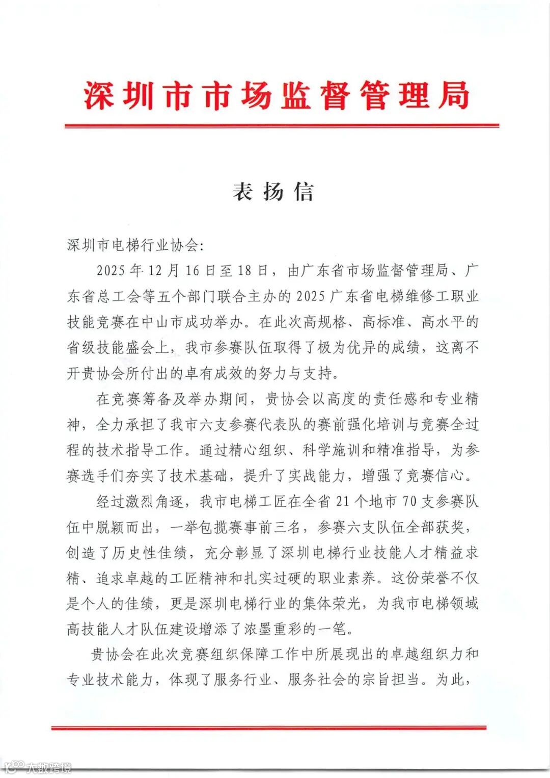 这份沉甸甸的表扬信,不仅是对该协会工作的认可,更是对全体参赛选手、技术指导专家魏勇、吴剑波、李甲智等同志以及所有工作人员辛勤付出的崇高致敬。成绩的取得,得益于各会员单位的积极响应与人才支持,得益于行业同仁的团结协作与共同努力,更得益于深圳市市场监督管理局一直以来对电梯行业高技能人才队伍建设的高度重视与持续推动。