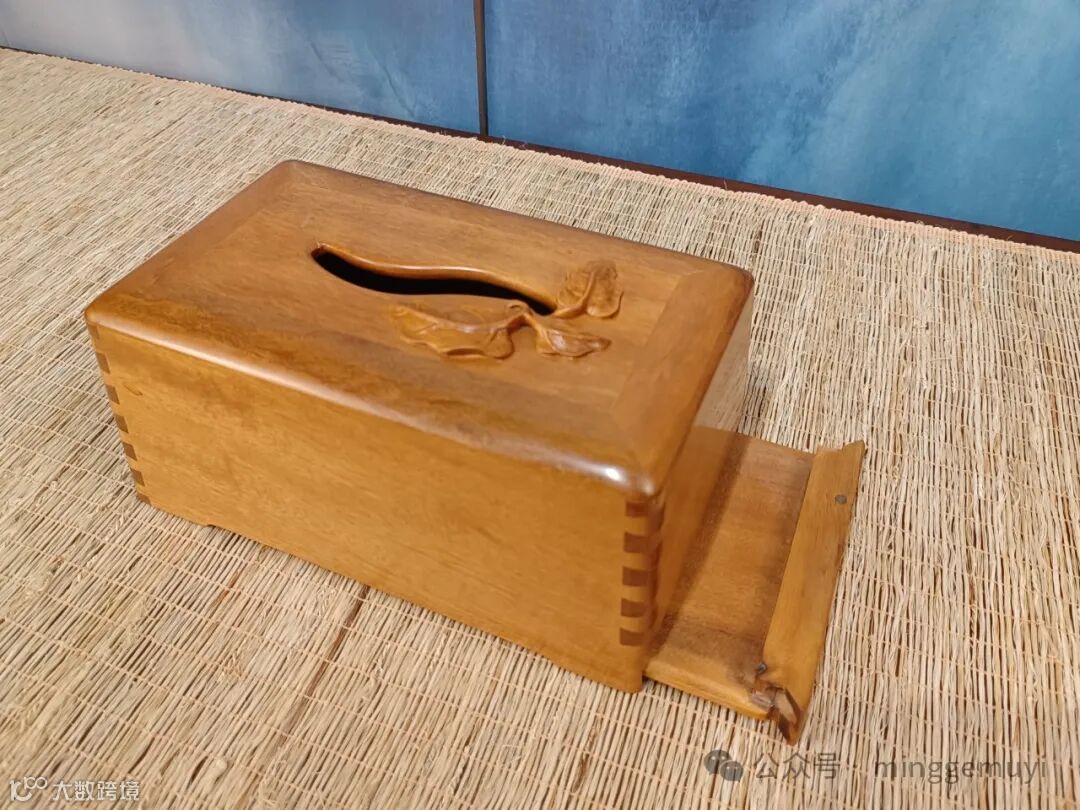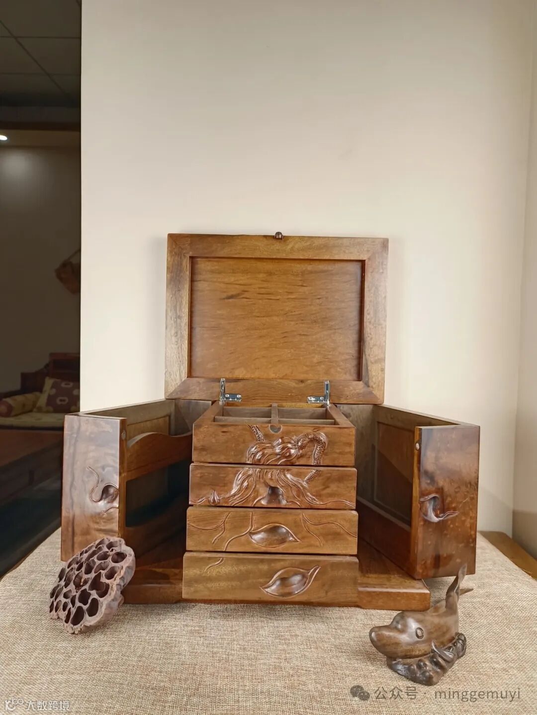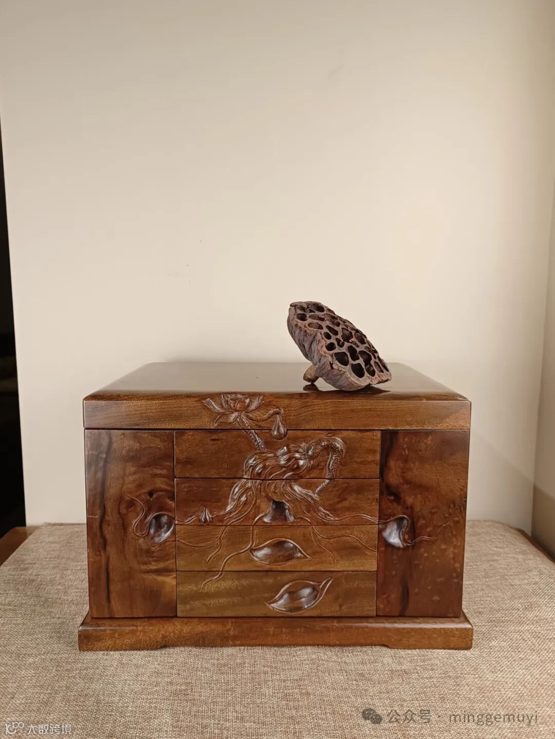 亭亭玉立的荷花,苍劲的荷叶,飘零的花瓣,一幅惠风和畅的诗情画卷。作品采用金丝楠乌木(雨滴纹加独板三连凤尾纹),传统榫卯工艺,桐油揩擦,以及传承人创意木雕匠心制作。是爱美爱音女士闺房专用之物,收纳功能强大,为梳妆,配戴,妆嫁之专用,也是收藏与传承之佳品。