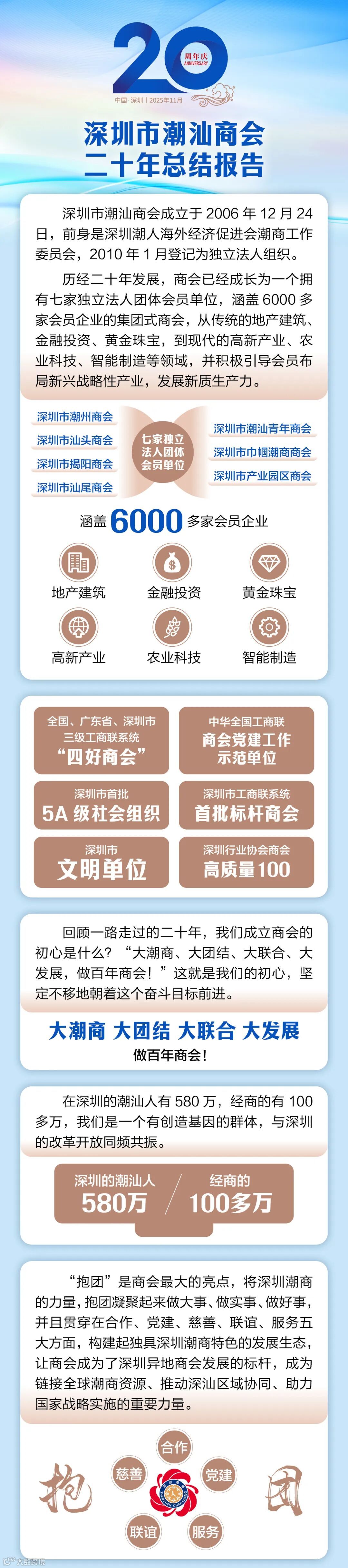 二十年风雨兼程,深圳市潮汕商会始终以“抱团”为核,凝聚潮商智慧与力量,书写了一段段合作共赢的奋进篇章。在产业发展中,我们携手激活新动能,推动经济创新与转型;在公益道路上,我们齐心践行社会责任,以慈善温暖社会;在党建引领下,我们筑牢政治根基,确保发展行稳致远;在全球舞台上,我们紧密联谊,汇聚潮商资源,共拓国际视野;在会员服务中,我们精准赋能,助力企业成长与突破。值此深圳第九次潮商大会暨二十周年庆典、第六届理监事会就职盛典即将启幕之际,让我们共同回顾奋斗足迹,展望未来新程,见证潮商精神闪耀时代!