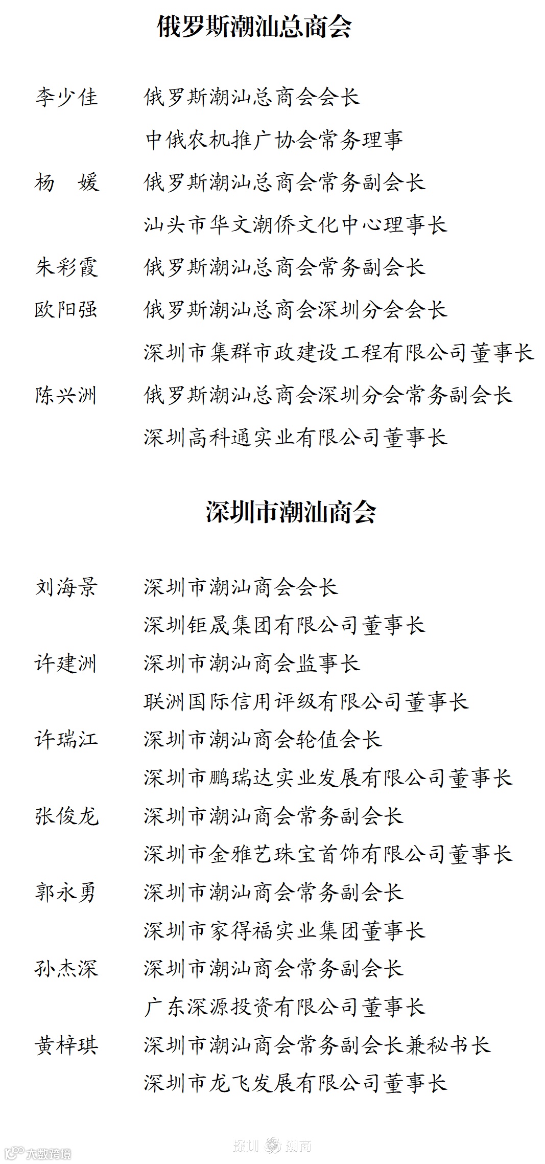 未来,俄罗斯潮汕总商会将致力推动建设中俄文化交流中心,大力宣传和弘扬潮汕文化,使其成为促进中俄文化交流互鉴的重要载体。期待与深圳市潮汕商会建立更加紧密的沟通协作机制,为巩固和发展中俄新时代全面战略协作伙伴关系贡献民间商会的智慧与力量。