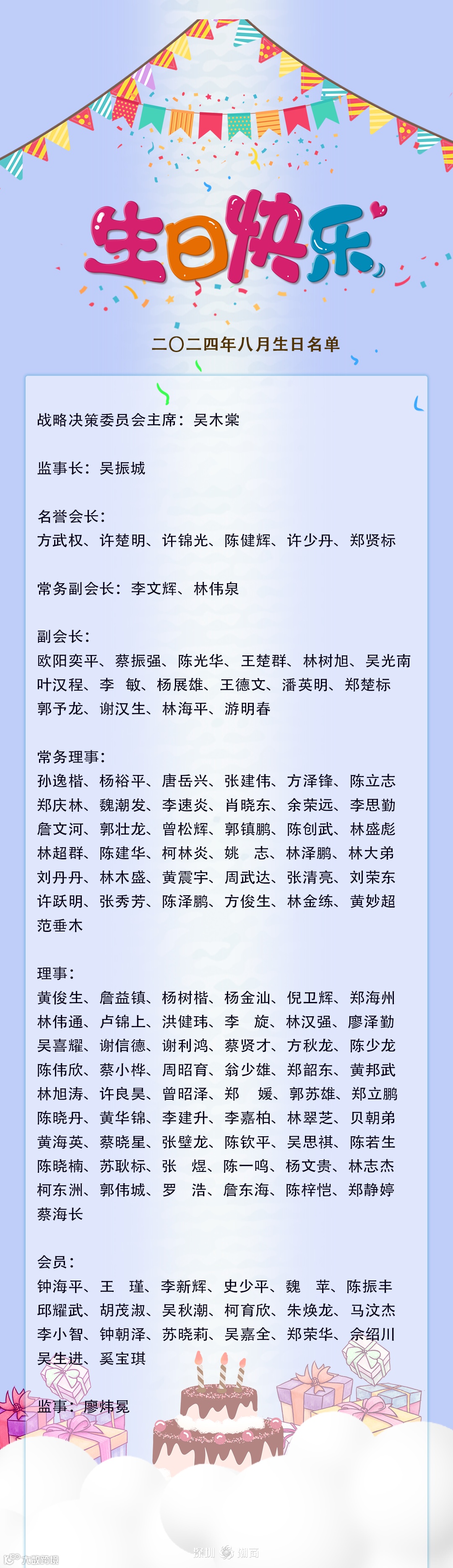 值此寿辰,郑汉明会长、黄育宏驻会会长、吴振城监事长携全体理(监)事会成员恭祝您生日快乐、身体健康、万事如意、阖家幸福!