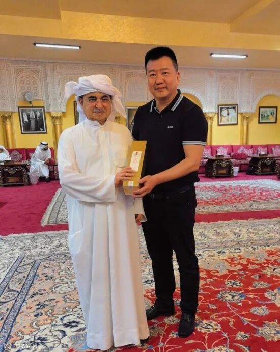 陈亮(右)赠送兴乆岩茶给谢赫・费舍尔・卡西米殿下(左),兴乆岩茶成为皇室的专供用茶。