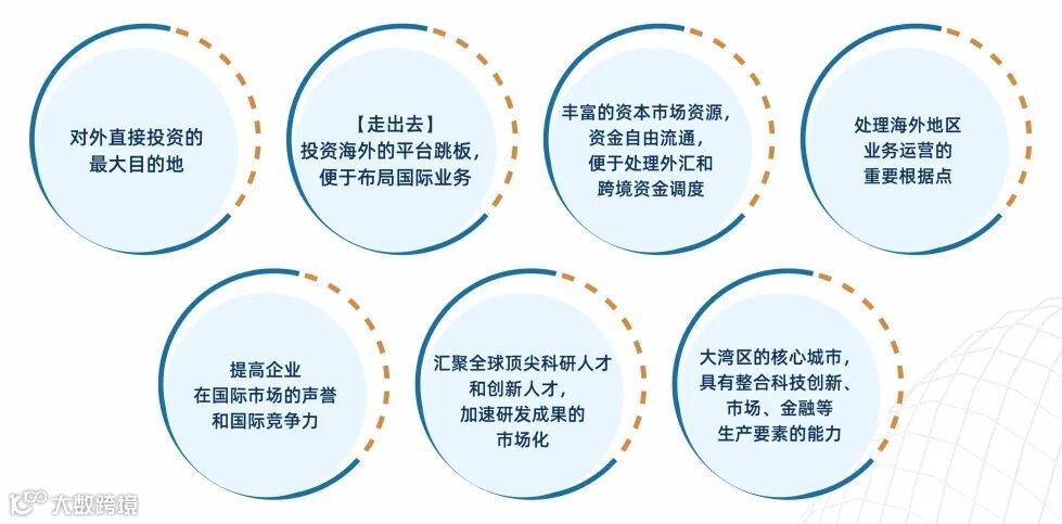 2022年,以中国内地为母公司的香港企业有2,114家,其中有578家以香港作为地区总部或办事处。截止2022年底,在港交所上市的内地企业有1,409家,占上市公司总数的54%,总市值约27.4万亿港元,占整体总市值的77%,香港是内地企业海外融资的首选平台和粤港澳大湾区的重要功能平台。