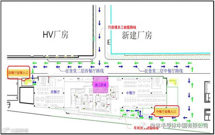 员工从行政楼前往HV餐厅就餐路线,见附图蓝色箭头指示方向。