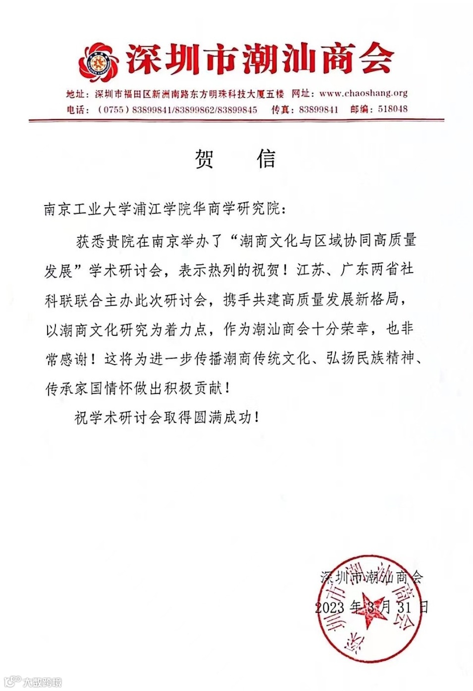 为贯彻党的二十大精神,携手共建高质量发展新格局,由广东省社会科学界联合会、江苏省哲学社会科学界联合会主办、南京工业大学浦江学院华商学研究院承办,汕头市社会科学界联合会、潮州市社会科学界联合会、南京市潮汕商会、潮州砚峰书院协办的“潮商文化与区域协同高质量发展——构建粤港澳大湾区和长三角一体化新格局”学术研讨会将于4月28日在南京工业大学浦江学院举行。我会发去贺信,预祝研讨会取得圆满成功。