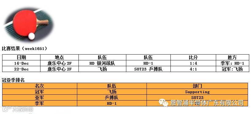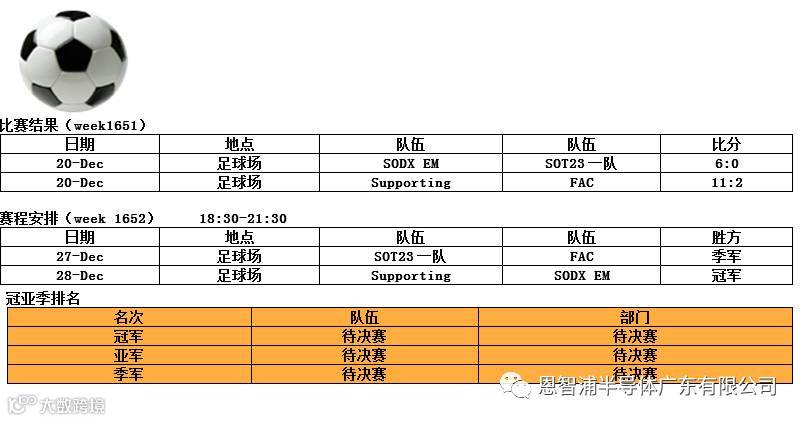 各个项目的比赛结果(week1651)及 赛程安排(week 1652)如下: