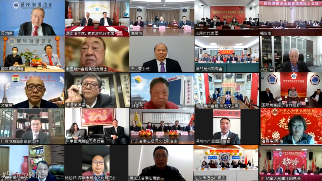 国际潮团总会于2023年2月1日举行新春团拜在线会议向家乡领导及乡亲拜年。潮州市委书记何晓军、揭阳市政协主席崔建军、汕尾市政协主席李耿坚、各地潮属社团首长们及会员单位出席本次会议,大家透过视频连线欢聚一堂,畅叙乡情、共话未来、共贺兔年新春。团拜会由国际潮团总会执行主席陈幼南主持。我会创会会长吴开松、驻会会长黄育宏、常务副会长何奕鹏出席线上会议。