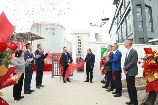 百安石化、百胜环保董事长梁志斌和百胜环保总经理谢维增为百胜环保牌匾揭幕。