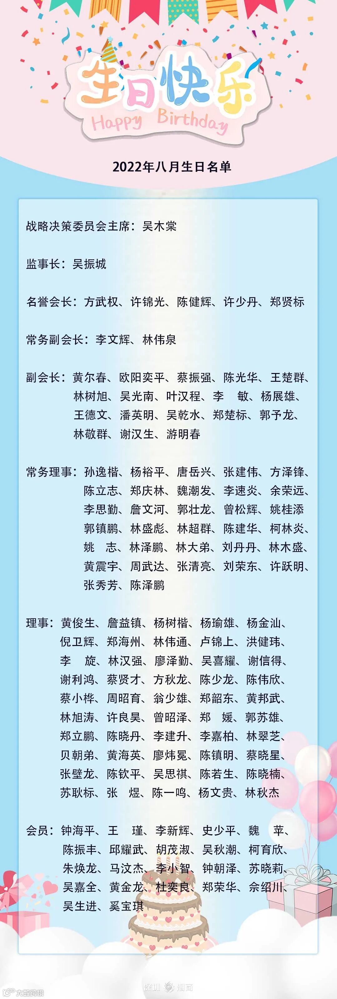 值此寿辰,郑汉明会长、黄育宏驻会会长、吴振城监事长携全体理(监)事会成员恭祝您生日快乐、身体健康、万事如意、阖家幸福!
