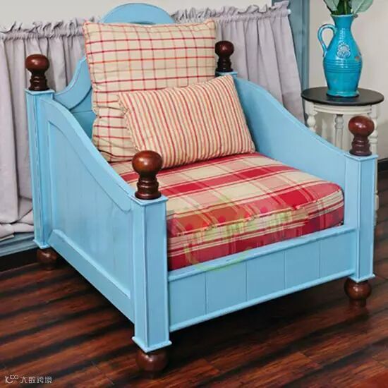 地中海风格的单人沙发,蓝色木质方形底座独具个性,充满海的韵味,红白格子的坐垫在颜色上起到了对比和突出的作用。