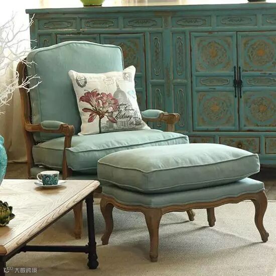 做旧的木头充满了沧桑感和年代感,嫩绿色与白色的搭配富有田园气息,再配一只色彩缤纷的抱枕,顿时有了欢愉的田园情趣。