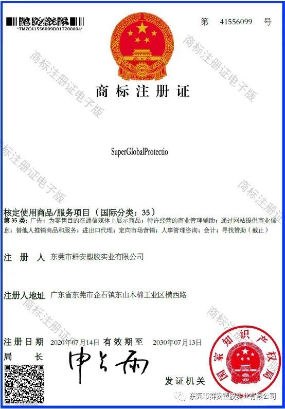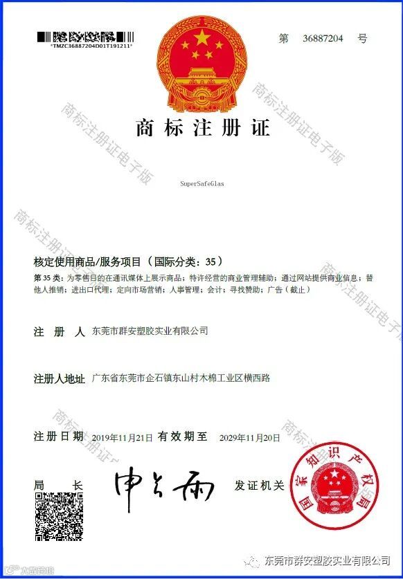 群安实业(国产SGP胶片生产商)领导者已注册一批新商标证书啦!!!