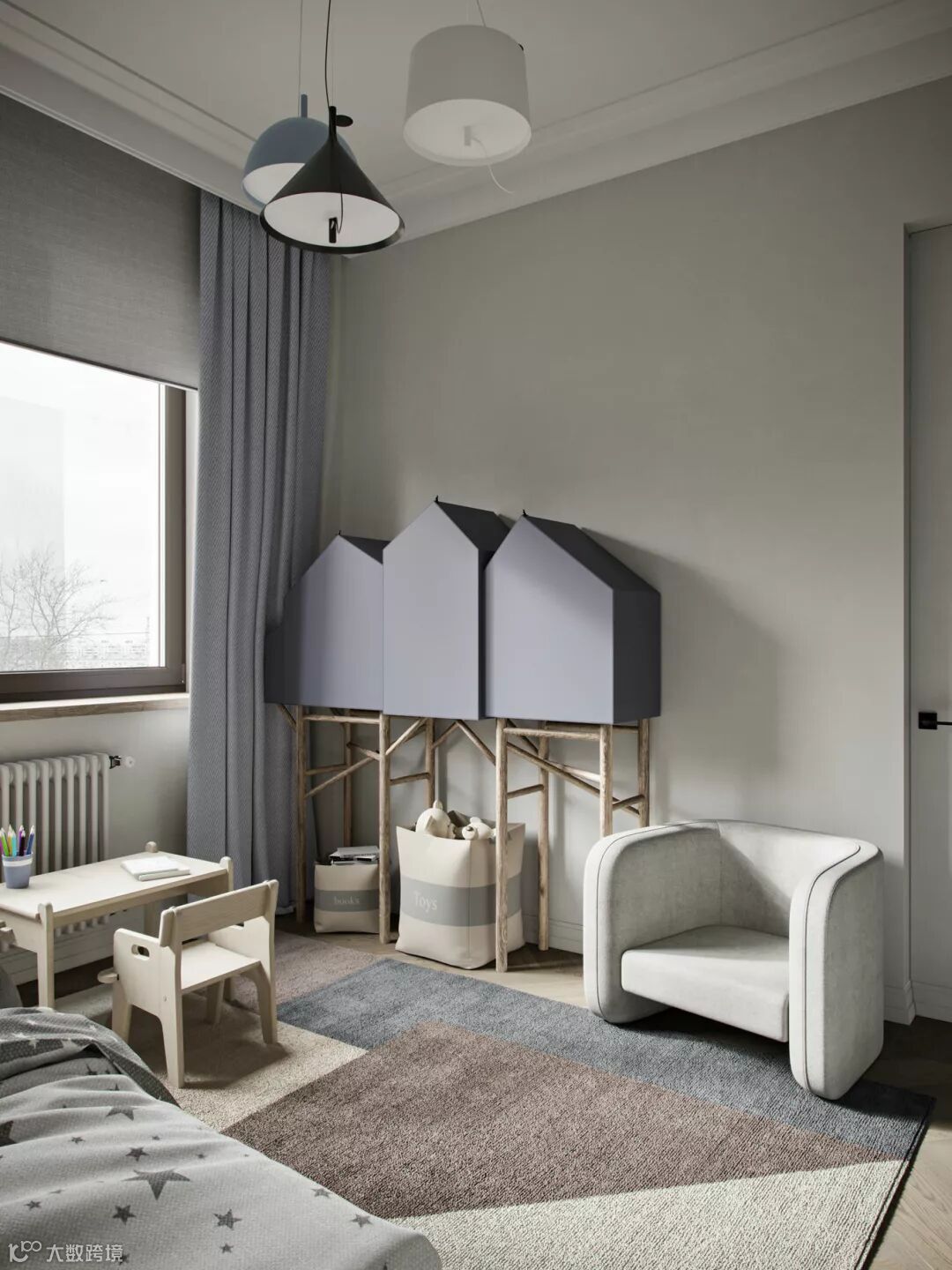 前期考虑到幼龄儿童,空间布局会以活动区域为主,随着孩子年龄递增,逐步调整家具,像是学习桌椅等。