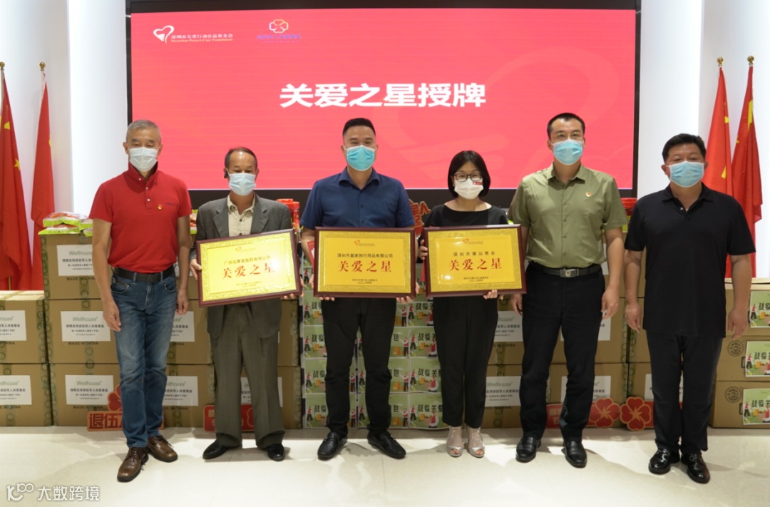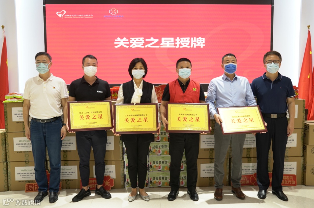 仪式现场,深圳市退役军人红星志愿总队队长林建文和福田区退役军人红星志愿服务队队长陶玉斌接收了企业的爱心捐赠,深圳市关爱行动公益基金会理事长张占恒、深圳市退役军人服务中心思想权益部部长王鹏、福田区退役军人事务局副局长龚龙、福田区退役军人服务中心主任杨红星、关爱基金会•退役军人发起人黄干达等领导向爱心企业颁发了“关爱之星”荣誉牌匾和抗击疫情感谢信。