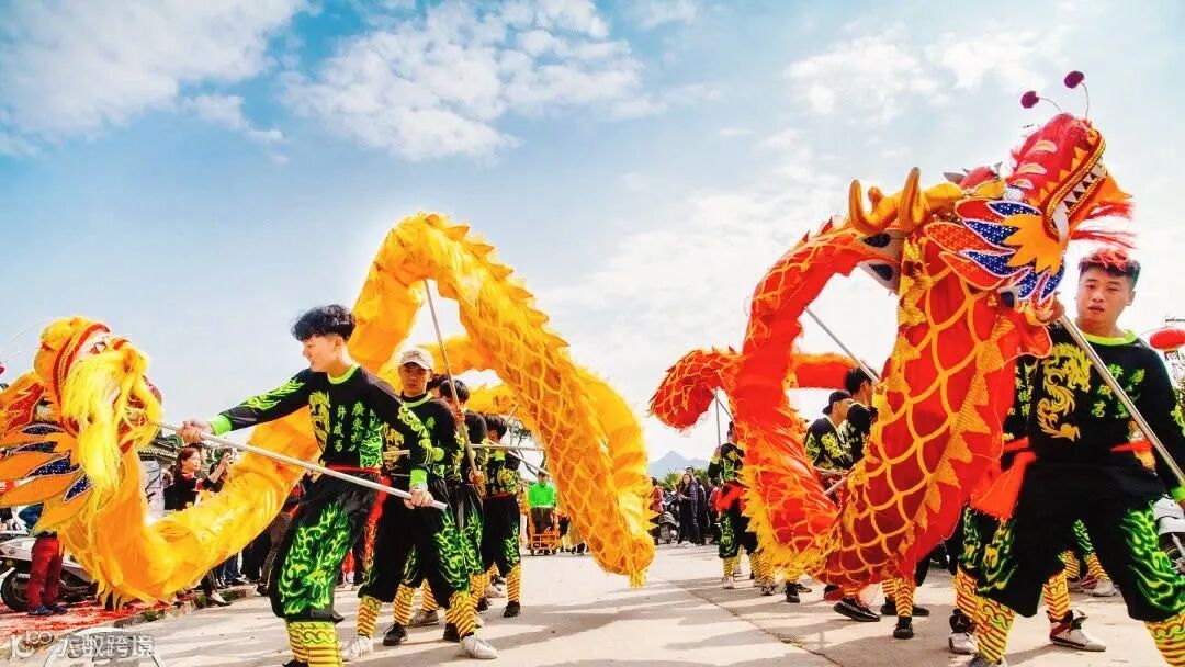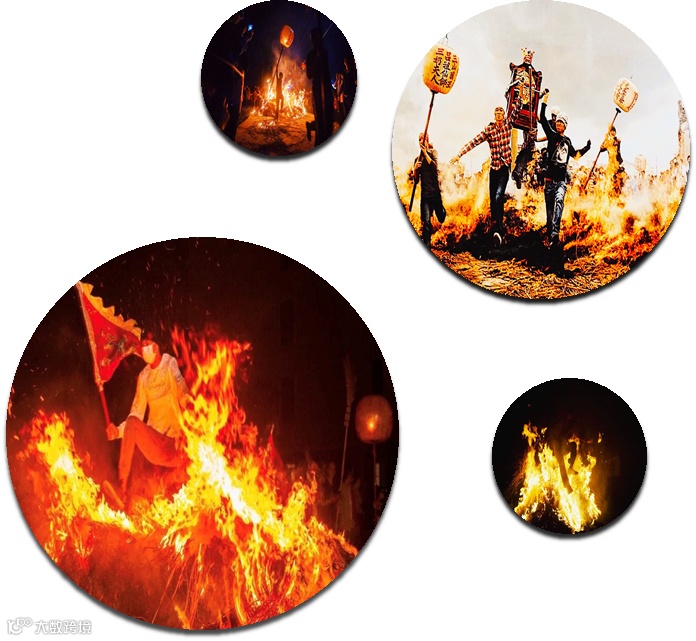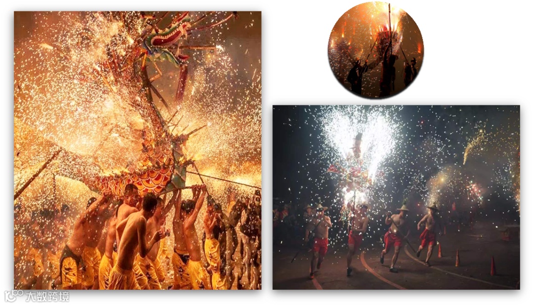 游龙、舞龙、烧龙,舞火龙者赤裸上身,头戴竹笠,托举着插满焰火的彩龙表演节目,祭天祈福。