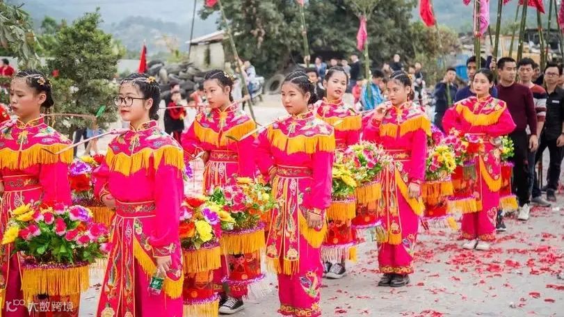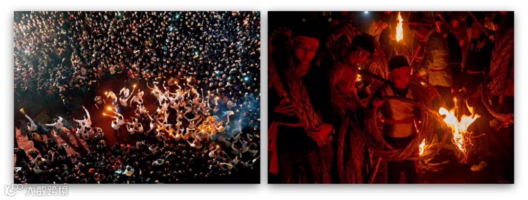 头扎红巾、腰缠红带、身穿紧身短裤,手提竹编火把,敲锣打鼓,巡古寨、绕主村,招引光明,迎接福瑞。