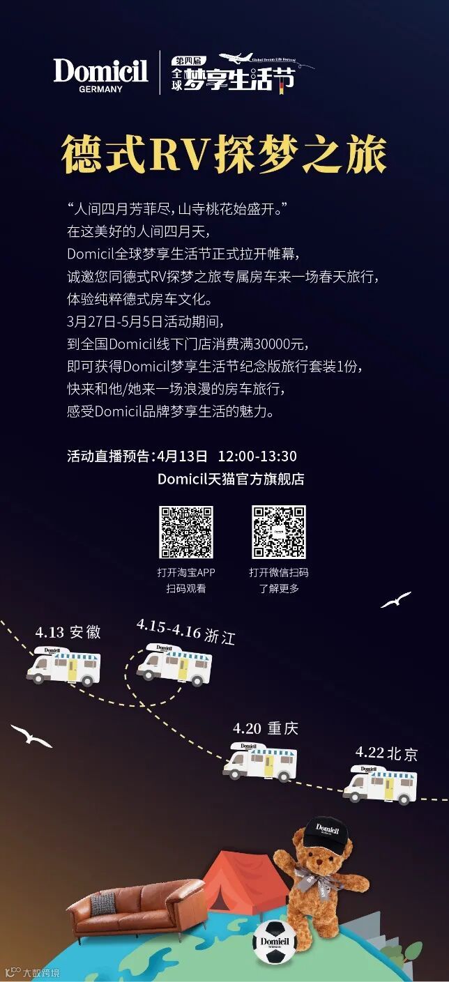 3月27日—5月5日活动期间,Domicil诚邀全国优质新老客户,开启德式春游房车探梦之旅,途径合肥、杭州-重庆-北京四城,快来一起体验纯粹德式房车文化,记录心动瞬间,感受品牌家·梦享·生活的魅力吧!