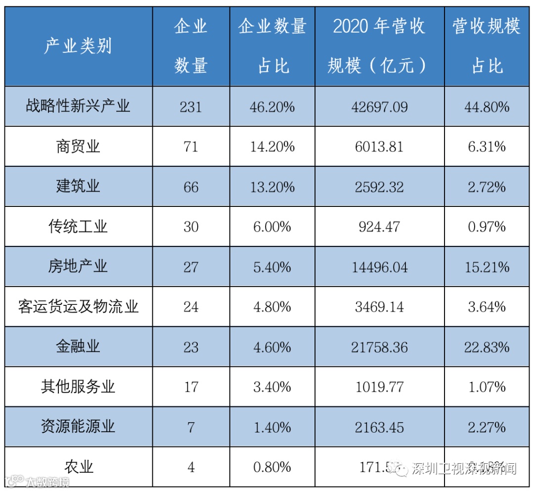 (2021深圳500强各行业企业数量及营业收入情况一览表)