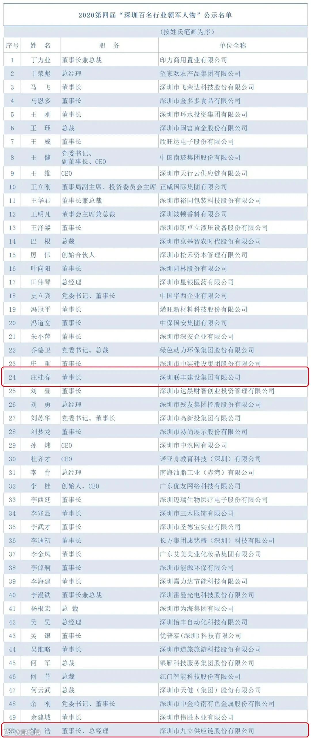 我会名誉会长、深圳市金活实业有限公司董事长兼总经理赵利生,常务副会长、深圳市九立供应链股份有限公司董事长邹浩,副会长、深圳市康泰健牙科器材有限公司总经理张朝标,常务理事、深圳市联丰装饰设计工程有限公司董事长庄桂春等荣获“深圳百名行业领军人物”并出席活动接受颁牌。